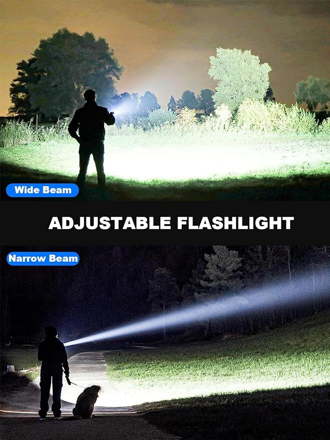 - 【5 Lighting Modes & Adjustable Focus】Our high-lumen rechargeable flashlight comes in 5 modes (high/medium/low/flash/SOS), press the 3S button to turn off all modes. The brightest flashlight ever made has adjustable focus, and we have adjusted the grid lines to a maximum range of 3280 feet for clearer remote viewing.