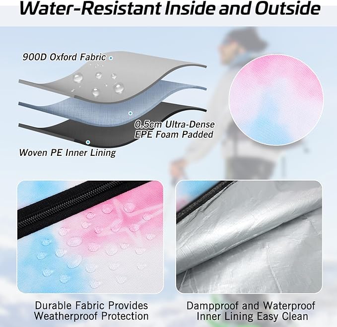 - Waterproof and Durable Material: Snow ski bag all water-resistant inside and outside, ski bag made of 900D wear-resistant polyester oxford fabric, dampproof and waterproof PE inner lining constructed for any weather conditions and easy to clean, unique ventilation and drainage hole design lets your bag keep dry, say goodbye to wet.