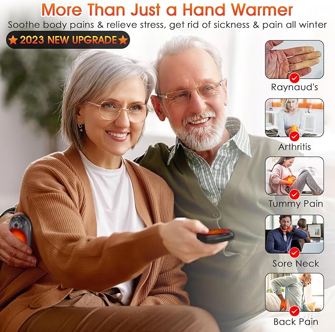 - 🔥【2 in 1 Portable Hand Warmers & Heat Therapy】Our 2 pack hand warmers rechargeable to address the traditional pain point, they can be used individually or combined into one. It warms our both hands at the same time, we also can share one with family, lovers, and friends. In addition, it is not only a handwarmer, but also can help relieve body pains and loosen muscles by increasing blood circulation, such as Raynaud's, arthritis, joint pain, cracked skin, frostbite, and menstrual cramps.