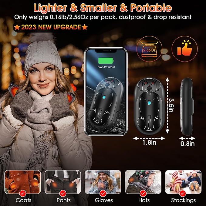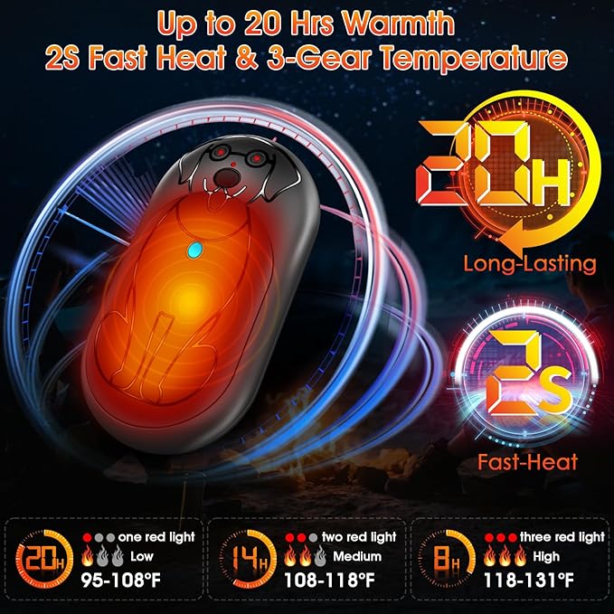 - 🔥【Up to 20Hrs*2 of Warmth & Only Weighs 0.16lb Per Pack】Twins Handwarmer, Palm Size, Large Energy. The upgraded highlight of the 6000mAh rechargeable hand warmers is the extra long-lasting time, which provides 8 to 20 hours of warmth per pack. The two can be used alternately to bring all-day warmth. Outer Labrador design, elegant appearance, compact and smooth structure, touch comfortably. The reusable hands warmer can be split into gloves, coats, pants, hats, stockings, etc.