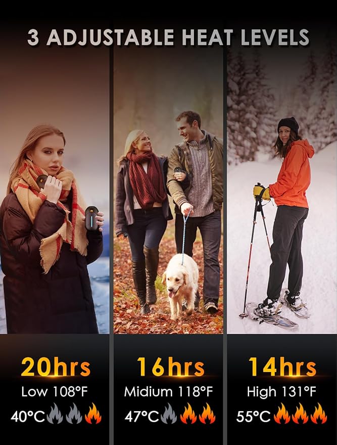 - FAST HEATING & 3 LEVELS - For stable and safe heating, We only use premium chipset to control the heat levels. With a 20% increase in power density, in only 2 seconds, our reusable hand warmer can quickly heat up to 95℉.3 levels of temperatures 95-107°F/104-118°F/118-131°F at your choice.
