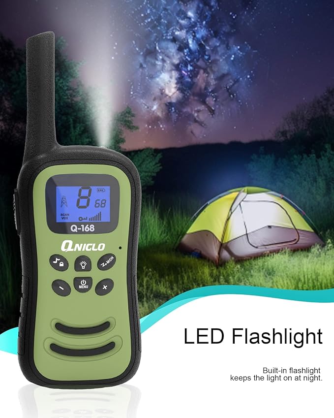 - 🎄🎁【Flashlight】Qniglo walkie talkies have blue LCD screens to provide you with enough visibility at night to clearly display the contents of the walkie talkies. The built-in flashlight can be your useful camping survival accessory, which can illuminate a five-meter range, ensuring your safety at night outdoor activities to a certain extent. It is also a explore toy for kids at night.