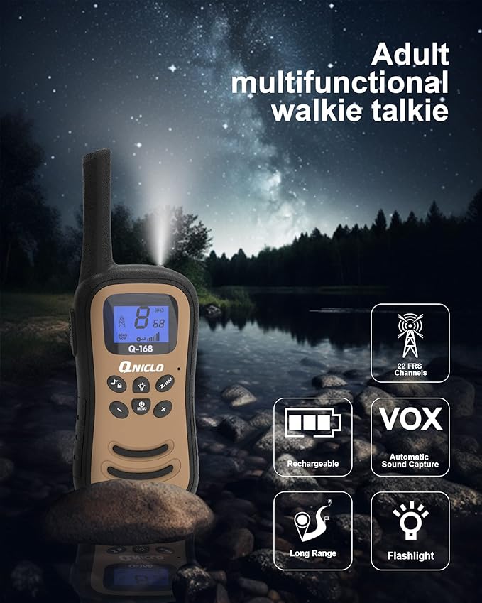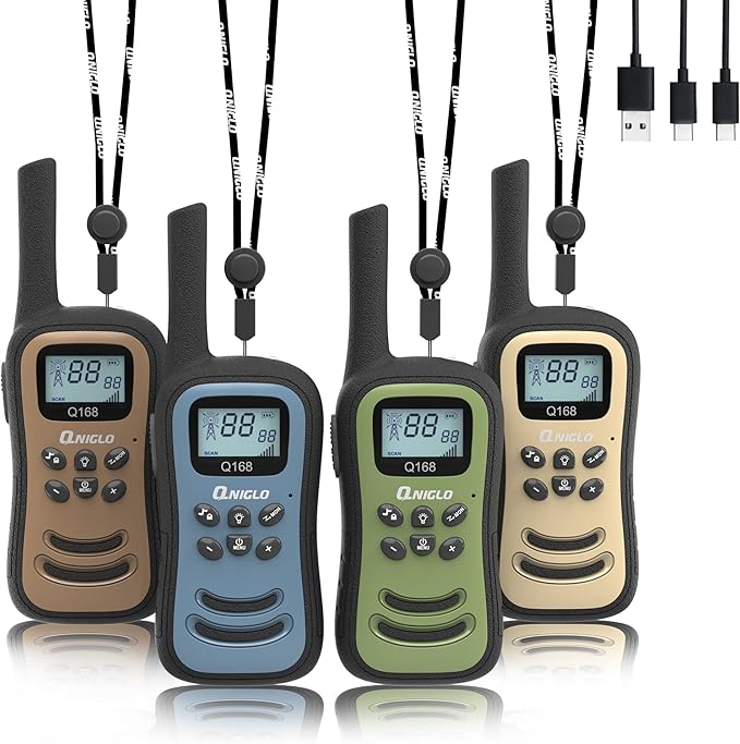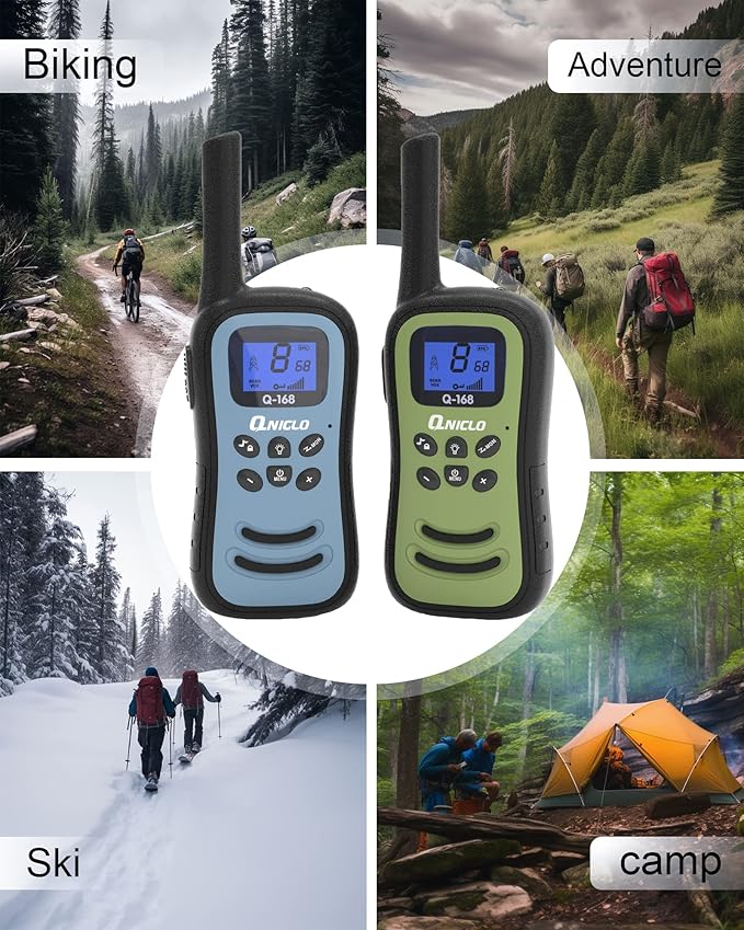 - 🎄🎁【Perfect Gift for All Ages】Qniglo walkie talkies for kids long range make more fun for your communication with your kids, friends, and parents. Kids walkie talkies will be the best choice for birthday, children's day, father's day and Christmas gifts. Be ready for outdoor life, hiking, camping, hunting, skiing, and cycling, and always stay in touch.
