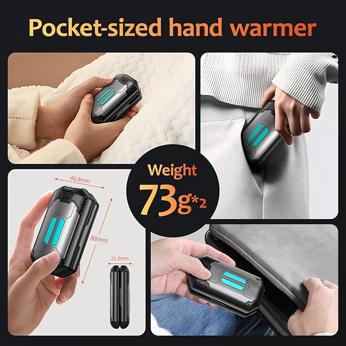 - 【Ultra-light,Ultra-thin and Stylish】The reusable hand warmer is made of selected materials of pure imported aluminum and imported flame-retardant ABS, inspired by the cool mecha appearance. Each hand warmer weighs only 73 grams when unpacked, so it can easily fit into your pocket or bag.