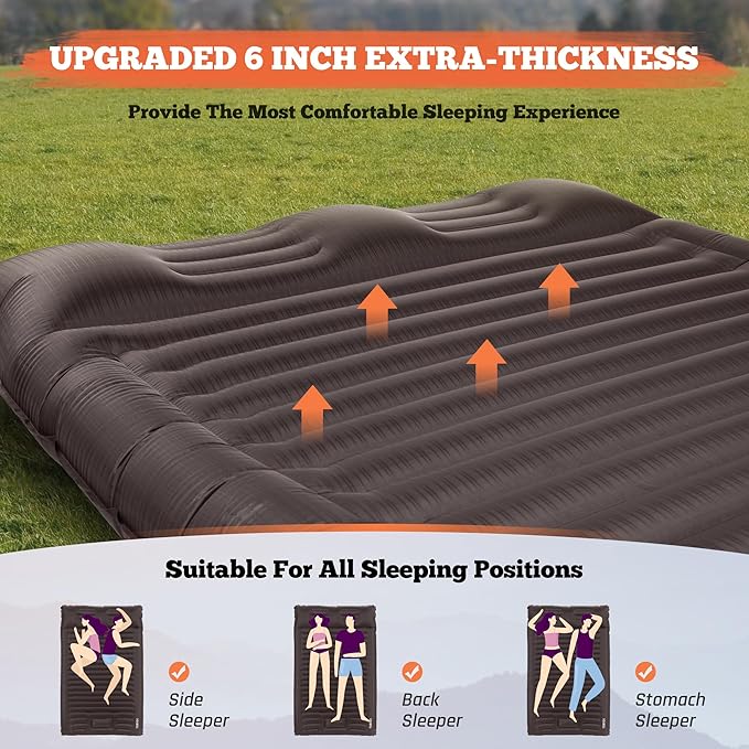 - EXTRA THICK MAT: Are you still suffering from the narrow and thin sleeping mat with your companion? If you pursue high sleep quality, you'll love this double camping mattress! The 6-inch thickness can perfectly hold the weight of two adults away from hard ground; the spacious size of 78.7*51" provides you with excellent comfort experience