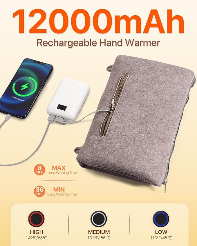 - 🔥【Fast Heating Graphene Hand Warmer Pouch】Electric hand warmers rechargeable adopts efficient graphene and double-sided heating design, fast heating up in 3S and release the warmth for you. 3 heat settings to adjust, 45℃/113℉, 55℃/131℉, 65℃/149℉, hand heating pad for plenty of heat to keep your hands warm in colder weather.
