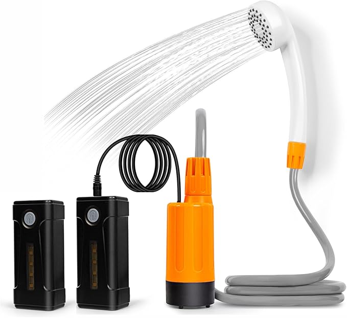 - 【Upgrade Powerful Portable Camping Shower】Portable shower provides stronger suction and more stable shower flow. One-button switch control, press the button to turn on the shower pump (high water flow 4L/min), press the button again to low water flow 3L/min, and then press to close the camp shower. Press and hold for 3 seconds to turn on and off the LED light, and take a shower easily in the dark.