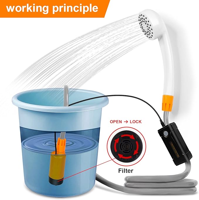 - 【Easy to install and operate】Just fully submerge the pump in the bucket/bucket and turn on the motor, it will pump water from the bucket into a steady, gentle shower flow, and you will get a smooth shower. Use when swimming in the sea, playing on the beach or going out camping.