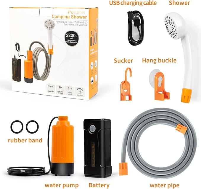 portable outdoor shower, battery driven shower pump, LED lighting, portable shower pump, draws water from a bucket into a stable and gentle shower flow,used for beaches,camping,gardens,hiking,