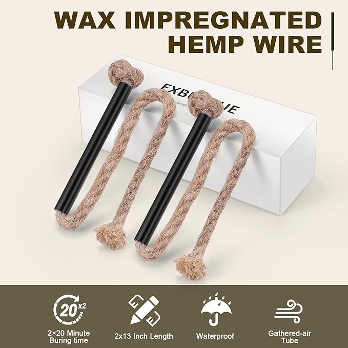 - This survival kit includes 2X13-inch Waterproof Tinder Wick Rope for starting a fire in less ideal conditions. Remove the metal tube and it serves as a bellows to blow the flame into life, helping easily get your damp tinder transformed into a roaring fire. That can burn for up to 40 minutes. Also could provide essential illumination in emergencies.