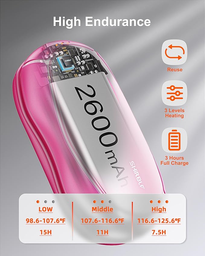 - 【Rechargeable & Three Levels of Temperature】Electric hand warmers, 5200mah rechargable hand warms with up to 12 hours battery life, USB hand warmer. With 3-speed indicator light, you can adjust three different temperatures, the use of time is 7-9.5-12 hours. Choose the right temperature for a comfortable using experience.