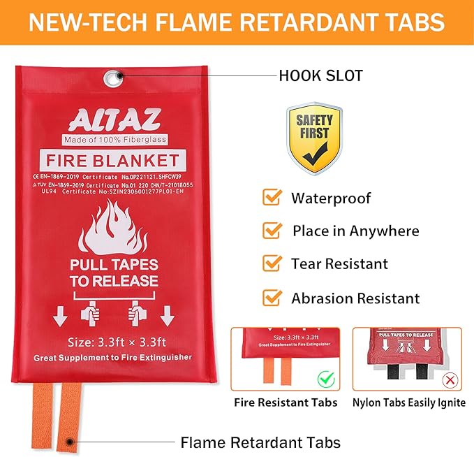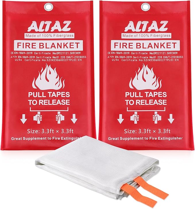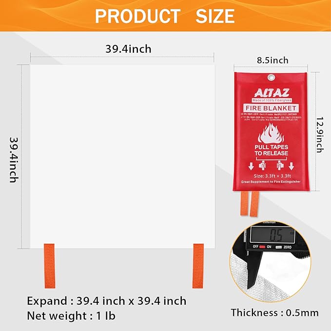 - 🔥【KEEP YOUR FAMILY SAFE】Safeguard your home and kitchen with ALTAZ upgraded emergency fire blankets. Designed as an emergency-prepared home safety device for peace of mind. You can put it on your body to escape from the fire scene. Gift Package: 2 Pack, blanket size is 39.4×39.4 Inches. Perfect as a great gift to your friends and family.