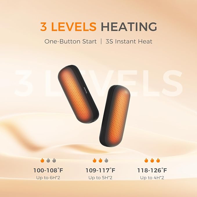 - Instant Heat, Lasting Warmth: Heat release in just 3 Seconds, 3 temperature settings up to 126 °F, Heat duration up to 4 to 6 hours; We offer a split USB-C charging cable, saving you charging time and allowing you to enjoy more warmth