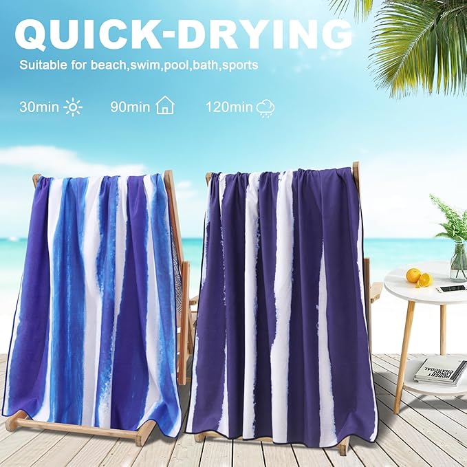 2 Pack Microfiber Oversized Beach Towel Lightweight Thin Sandproof Compact Quick Dry Clearance Towels Extra Large Sand Free Travel Beach Essentials Accessories Women Men Adult Gift Dark Blue Stripe