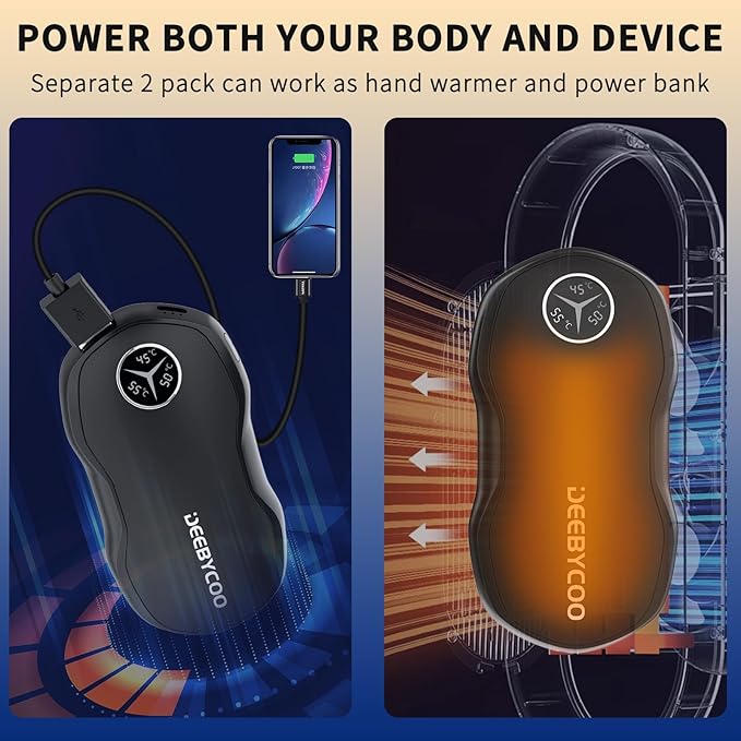 - 【2 in 1 Electric Hand Warmer】The 2-pack of rechargeable hand warmers can be used as 1 by the centre magnet, and they can be easily separated when necessary. The product combines the functions of a hand warmer and a power bank. The 2 hand warmers can be used separately, one for warming hands and one for charging other electronic devices.