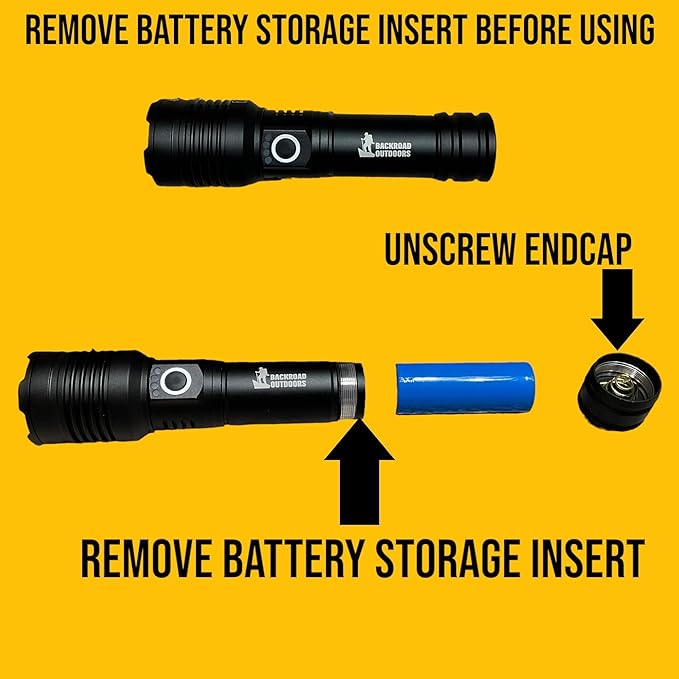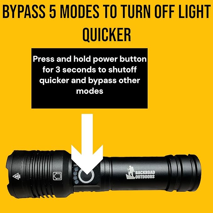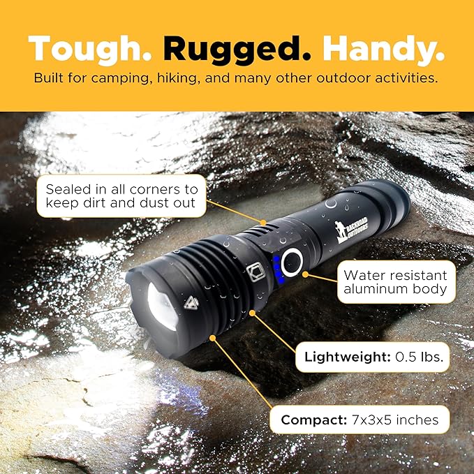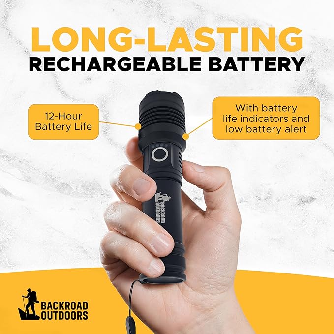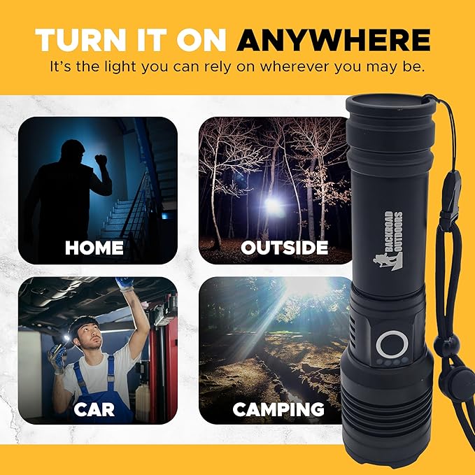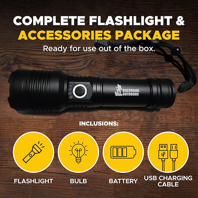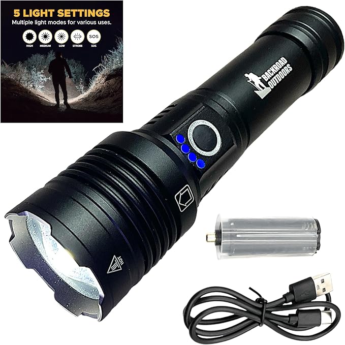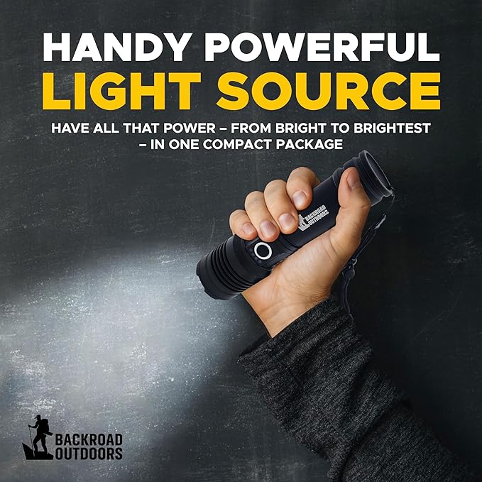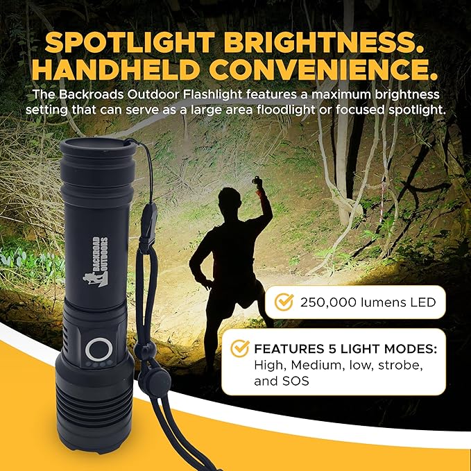 - DESCRIPTION- Backroad Outdoors flashlight has a 250,000 lumen LED light that can create a large area floodlight or a focused spotlight.