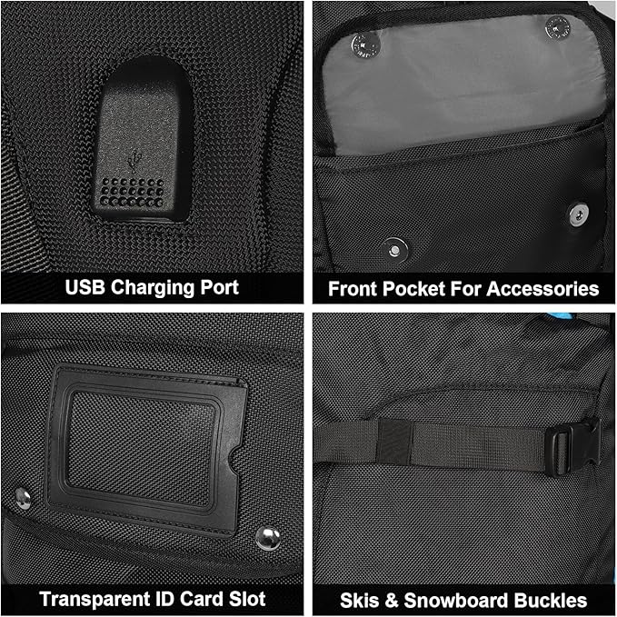 - 【SUITABLE FOR TRAVEL 】The ergonomic and adjustable padded shoulder straps never dig into the shoulders, giving more comfort when traveling. There are adjustable lanyard buckles on both sides, which can easily attach your ski and snowboard, flashlights, etc. If you have any questions or dissatisfaction with the product, please feel free to contact us, we appreciate your advice and will provide you with solution