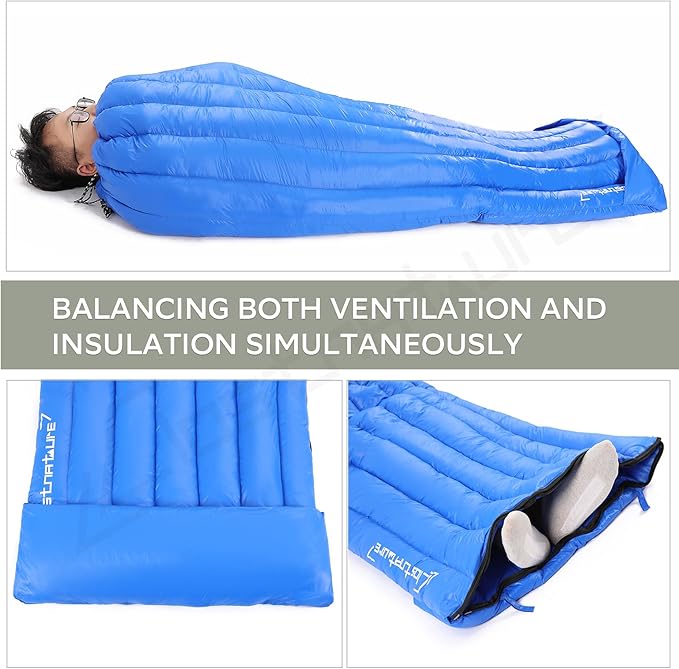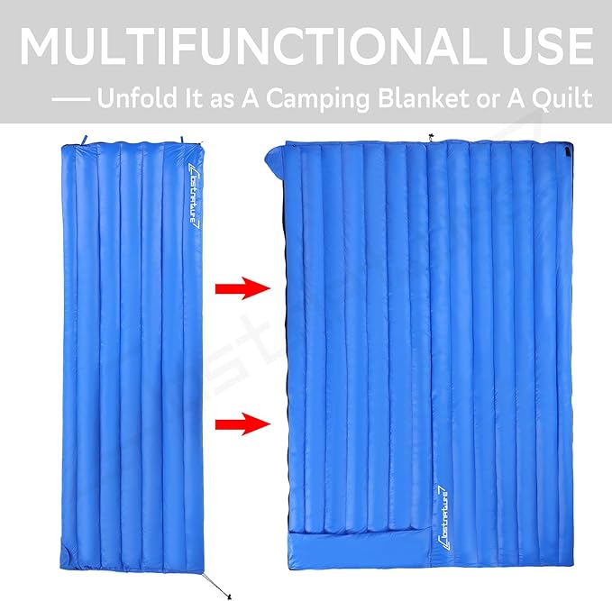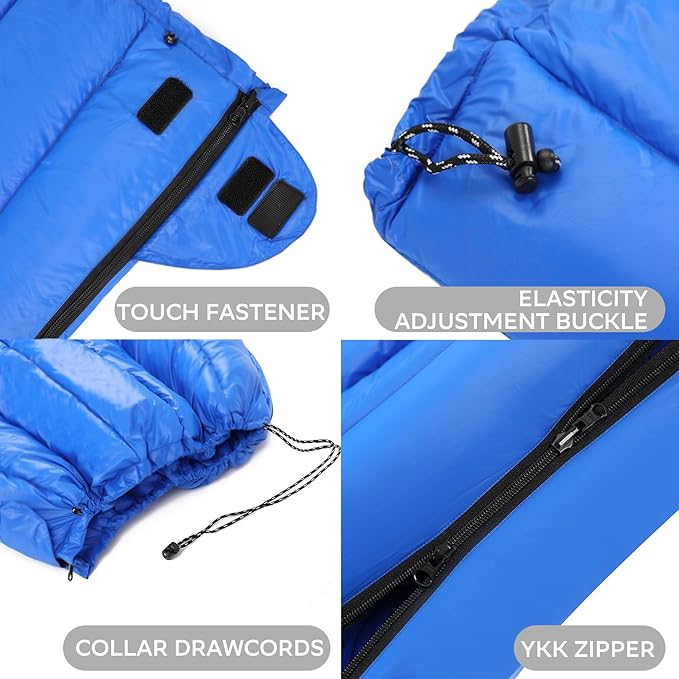 - ROBUST AND WATERPROOF: The down sleeping bags are crafted with 20D insulated nylon fabric, designed for enduringness and softness. Additionally, we employ advanced DWR waterproof coating for enhanced protection. It can provide a cozy sleeping environment while withstanding the demands of extreme outdoor weather conditions, ensuring it withstands the rigors of outdoor use for years to come. NOTE: Despite our various waterproof designs, down-filled products are not recommended for machine washing