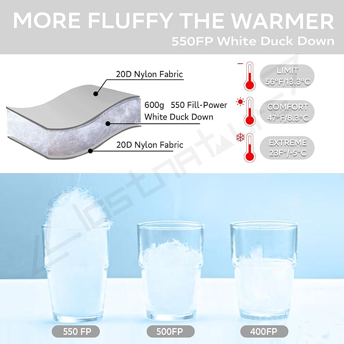 - PREMIUM DOWN INSULATION: Clostnature down sleeping bag using a full 600g 100% 550 fill-power white duck down. This pure, odorless down filling ensures excellent insulation without any impurities, providing a comfortable experience akin to floating on clouds. Before using an ultralight sleeping bag, you can gently tap it, which will make the inside more fluffy and provide you with a better experience. Recommended use temperature: 23F/(-5°C)-56F(13.3°C), comfortable temperature is 47F(8.3°C)