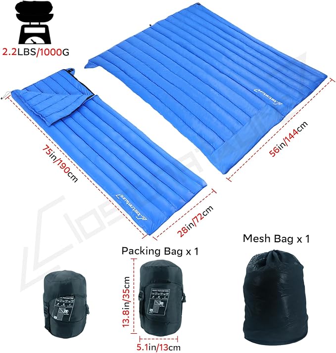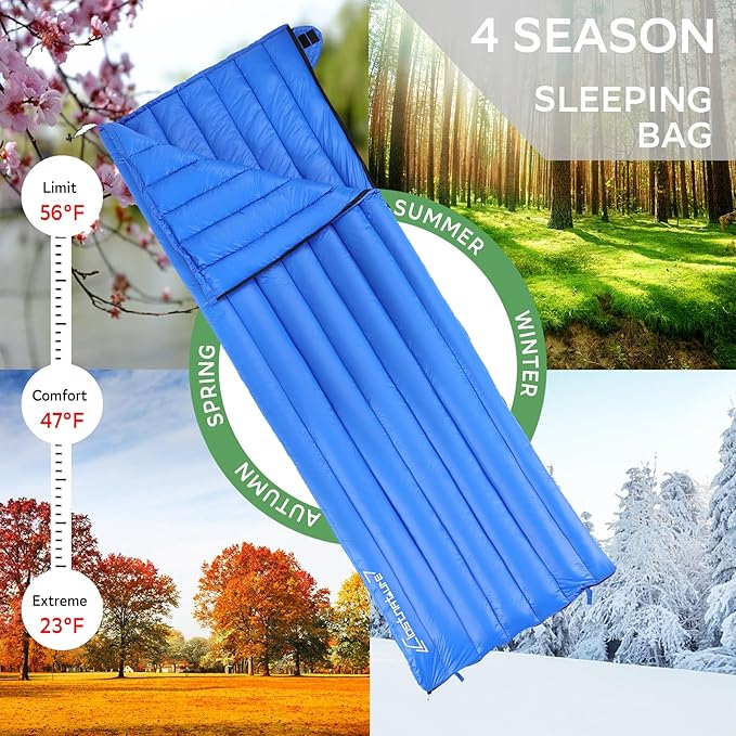 - ROBUST AND WATERPROOF: The down sleeping bags are crafted with 20D insulated nylon fabric, designed for enduringness and softness. Additionally, we employ advanced DWR waterproof coating for enhanced protection. It can provide a cozy sleeping environment while withstanding the demands of extreme outdoor weather conditions, ensuring it withstands the rigors of outdoor use for years to come. NOTE: Despite our various waterproof designs, down-filled products are not recommended for machine washing