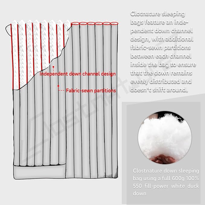 - UNIQUE DESIGN: Clotnature 3-4 season sleeping bags feature an independent down channel design, with additional fabric-sewn partitions between each channel inside the bag to ensure that the down remains evenly distributed and doesn't shift around. The L-shaped dual-way YKK zipper ensures bottom ventilation and a wrap-around pouch is sewn at the bottom for added warmth if desired. You can even unzip and use this warm sleeping bag as a blanket for larger sleeping arrangements
