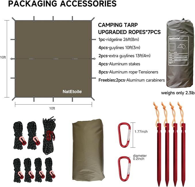 - ✔️𝐖𝐡𝐚𝐭'𝐬 𝐈𝐧𝐜𝐥𝐮𝐝𝐞𝐝 : Inside the 1.06kg carrying bag, you'll find everything you need: 1pc 10x10ft tarp, 4 x 10ft guylines, 2 x 13ft guylines, 1 x 26ft ridgeline guylines, 8 upgraded aluminum guyline tensioners, 2 extra freekies carabiners for added ridgeline security, 4 aluminum stakes, and assembly instructions for your reference.