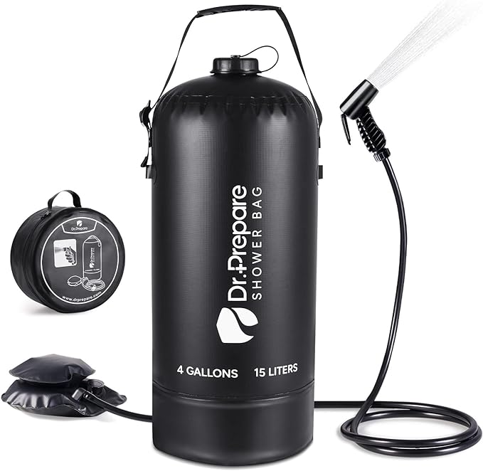 DR.PREPARE Camping Shower, 4 Gallons/5 Gallons Portable Camp Shower with Foot Pump, Dual Shower Options, Large Water Inlet, Portable Outdoor Shower for Camping, Beach, Hiking, Climbing