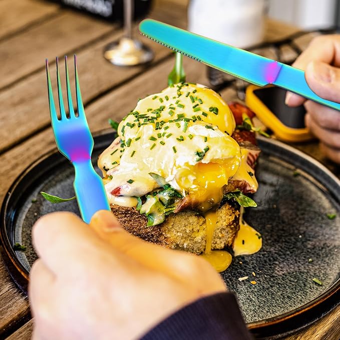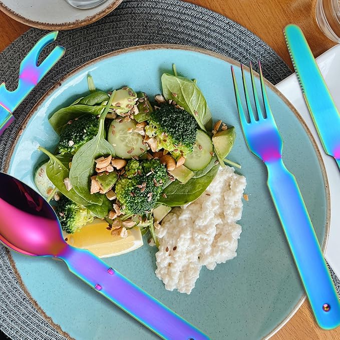 - COLORFUL: Add some fun and color to your camping meals with our Camping Rainbow Utensils Set. This set includes a fork, spoon, and knife, all in bright and vibrant colors to make dining outdoors even more enjoyable. A must-have for any camping enthusiast