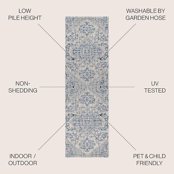 JONATHAN Y SMB105B-220 Estrella Bohemian Medallion Textured Weave Indoor/Outdoor Runner Rug, Coastal, Traditional, Vintage for Bedroom, Kitchen, Living Room, Easy-Cleaning, Navy/Gray, 2 ft. x 20 ft.