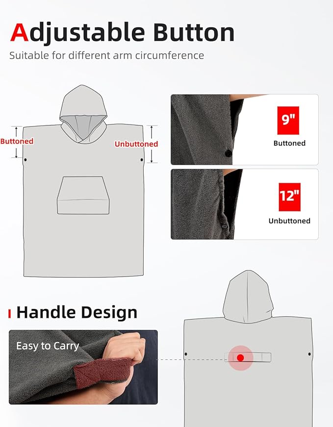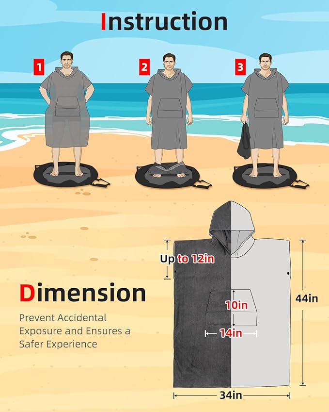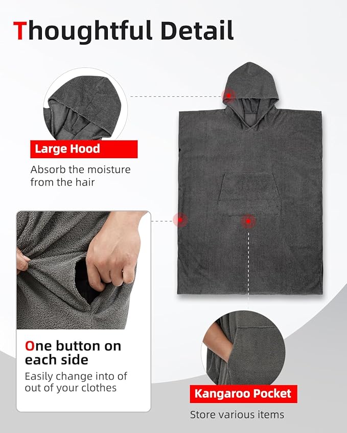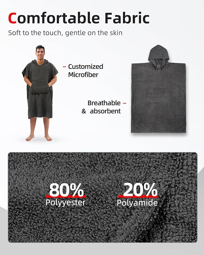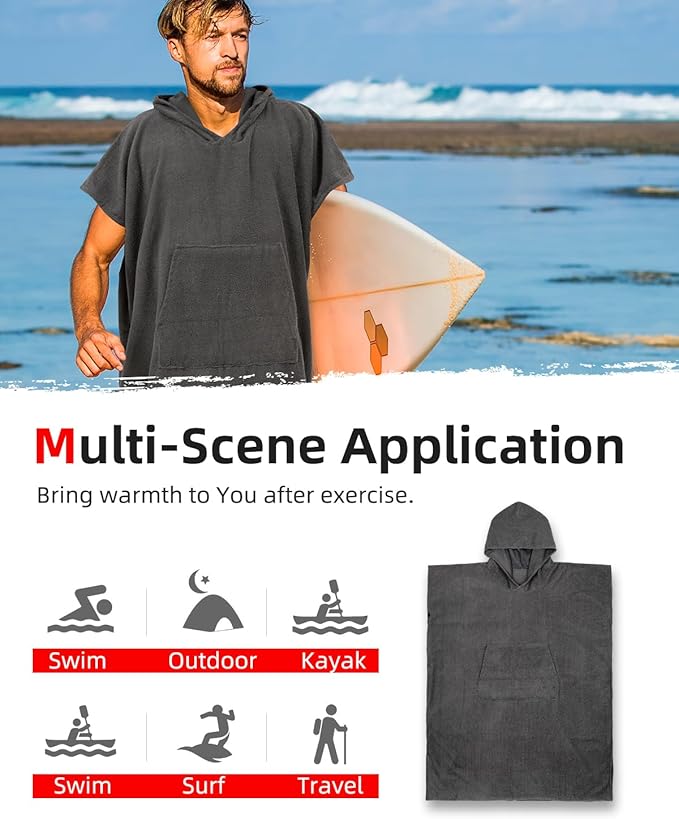 - Thoughtful Detail—More Comfortable:The material of the surf poncho changing robe is made of comfortable fabric which provide us gentle touching of the skin.Large hood of the surfing towel robe will help absorb moisture from the hair.The kangroo pocket keep many accessories like swim glasses and more.