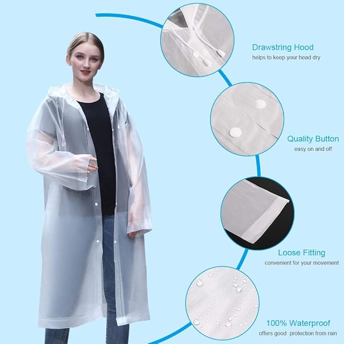 - ✅【Reusable & Portable】: Our clear poncho jacket for adults is not only quick drying, but also recyclable for a long time. At the same time, it is ultra-light and soft enough to be folded into a small size. You can easily keep one in your backpack/house/office or car for emergencies.