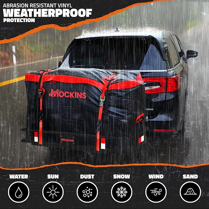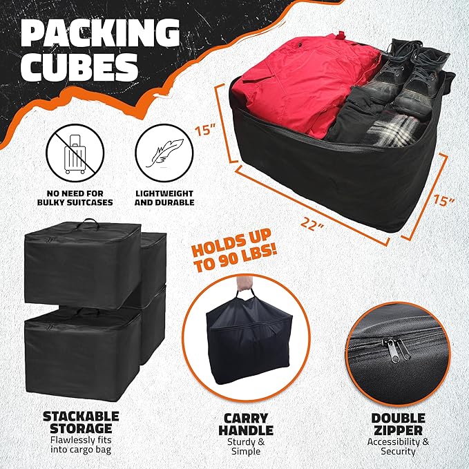 - CARGO TRAILER HITCH STORAGE w/ STACKABLE CUBES: Made from weatherproof vinyl, this hitch cargo carrier bag (48"x31"x18") fits the Mockins Hitch Mount Cargo Carrier perfectly! With 15 cu.ft. capacity, our waterproof luggage bag for truck bed includes waterproof zippers under a 2" flap with Velcro strips, side handles, loops, & a bag lock. Plus, our EXCLUSIVE 4 Packing Cubes streamline pre-packing your hitch rack . Each cube (22"x15"x15") holds 90lbs & fits neatly inside the truck bed cargo bag .