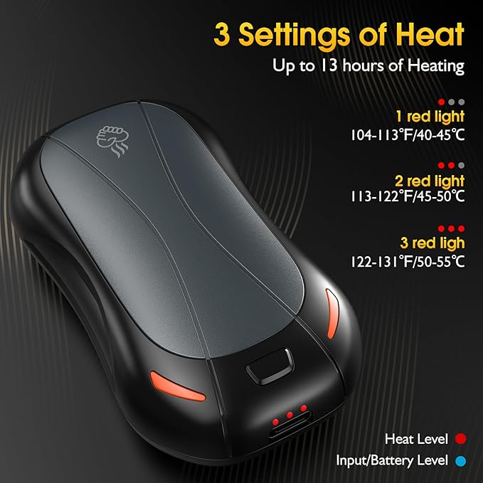 - [Three Levels of Instant Heating] FANDLISS 2pcs hand warmers don't need to wait for a long time, just press the switch, 1 second quick heating, immediately release the warmth for you. Three adjustable temperature levels (104-113°F/113-122°F/122-131°F) to meet your preference for warmth and comfort. Continuous heating time is long, providing you with long-lasting warmth on cold winter days.