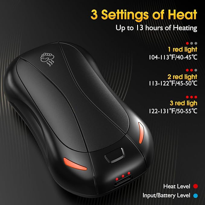 - 🔥【Three Levels of Instant Heating】FANDLISS 2pcs hand warmers don't need to wait for a long time, just press the switch, 1 second quick heating, immediately release the warmth for you. Three adjustable temperature levels (104-113°F/113-122°F/122-131°F) to meet your preference for warmth and comfort. Continuous heating time is long, providing you with long-lasting warmth on cold winter days.
