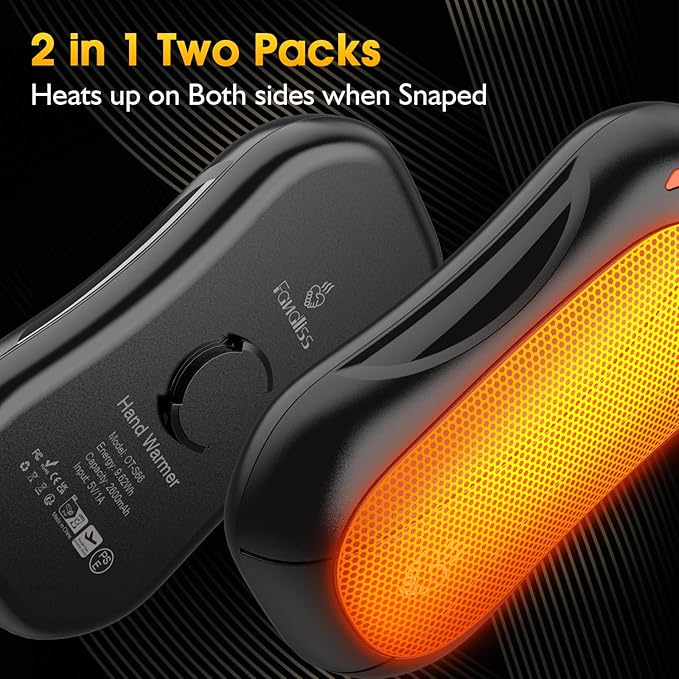 - 🎇【2-in-1 Portable Hand Warmer】FANDLISS rechargeable hand warmer with ergonomic split snap swivel design, small and portable pocket hand warmer can be put into any pocket or bag, you can heat your hands at the same time in the cold winter, or combined into one to meet the double-sided heating function, to meet your different needs in different situations!