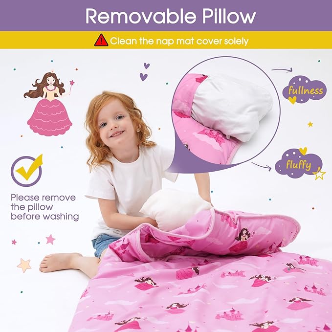 - DETACHABLE PILLOW AND BLANKET SET: Designed with a removable pillow and blanket, this large nap mat for toddlers includes plush, minky dotted fleece materials, and is ideal for preschool, daycare, and everyday care. It offers easy washing and storage