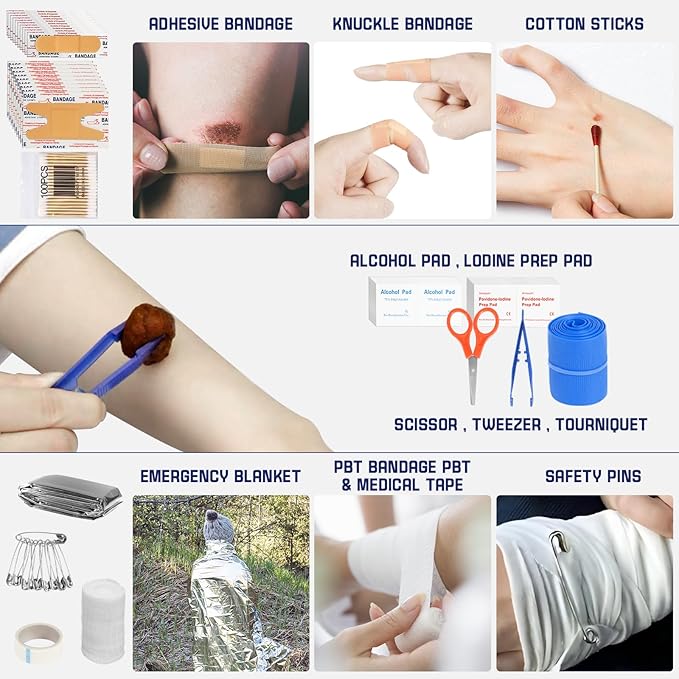 - 【Camping First Aid Kit】Our top-quality camping first aid kit is designed to provide essential medical supplies and treatment options in emergency situations. It is equipped with an emergency blanket, non-woven medical tape, an alcohol pad, cotton swabs, scissors, gloves, tweezers, and other essential items to treat common injuries during camping trips.