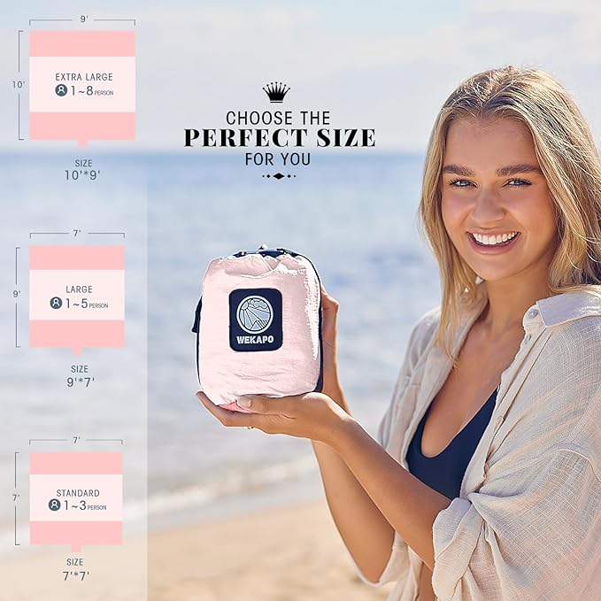 WEKAPO Beach Blanket Sandproof, Extra Large Beach Mat, Big & Compact Sand Free Mat Quick Drying, Lightweight & Durable with 6 Stakes & 4 Corner Pockets