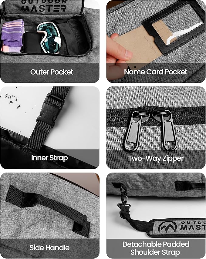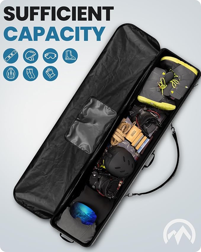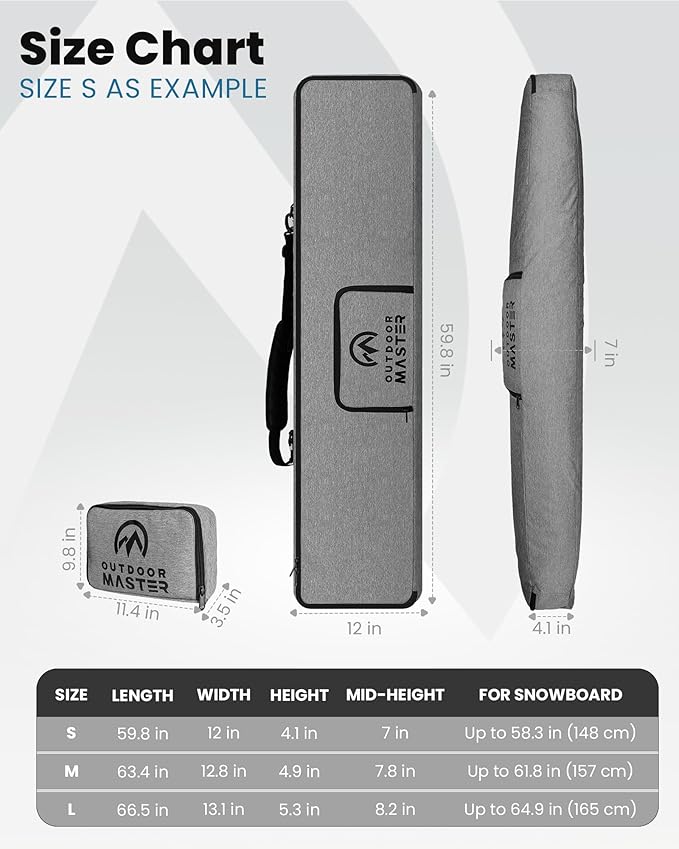 - Fits Most - Available in 3 sizes suitable for most standard snowboards. With widths ranging from 30.5cm to 33.5cm and mid-heights from 18cm to 21cm across different sizes, it offers ample space for snowboards with bindings, ski boots, helmets, jackets, ski accessories, and more.