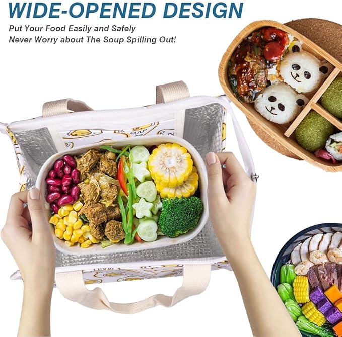 - WIDE-OPEN & VELCRO CLOSURE: the entrance of the thermal lunch box can be opened up to 9.4"L x 6.7"W big. Therefore your containers can be put into the bag and taken out of the bag HORIZONTALLY without risking leaking or spilling. Velcro closure not only makes easy access to your food but also tightly secures your foods in the bag.