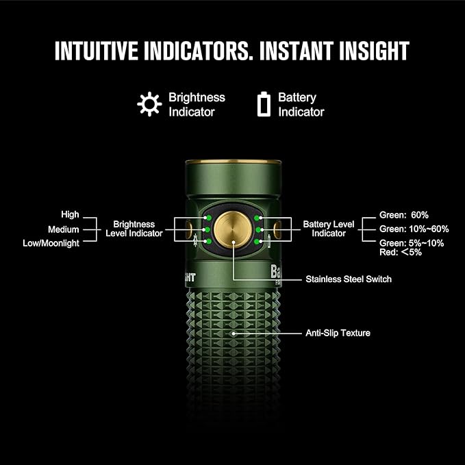 - [𝗨𝗽𝗴𝗿𝗮𝗱𝗲𝗱 𝗜𝗻𝗱𝗶𝗰𝗮𝘁𝗼𝗿] The pocket flashlight features two kinds of indicators. The indicators intuitively show brightness level and battery power