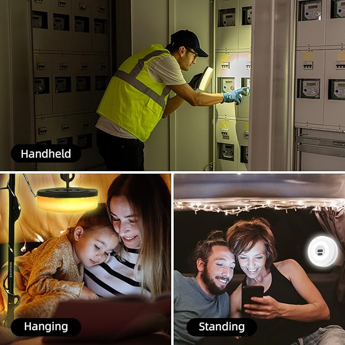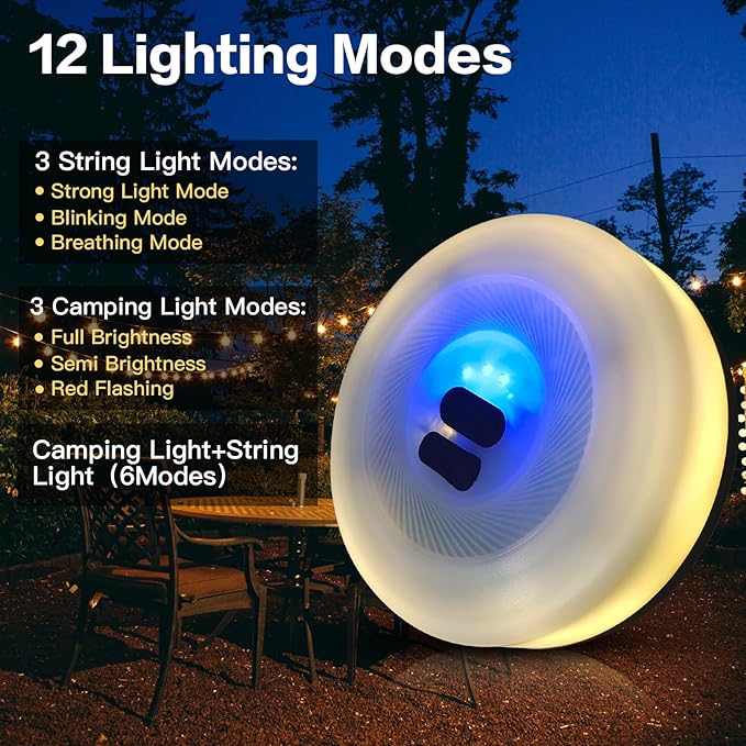 - ✨【12 Modes Flashlight & String Light】This camping light has two switch buttons, providing 12 lighting modes: the string light has 3 modes including stable highlight, flashing, and breathing mode; The main light flashlight has three modes: high light, low light, and SOS red light flashing; Flashlights and string lights can also be used together, and 6 modes can be customized. Whether indoors or outdoors, whether lighting or decoration, our camping lights will be a great helper for your life.