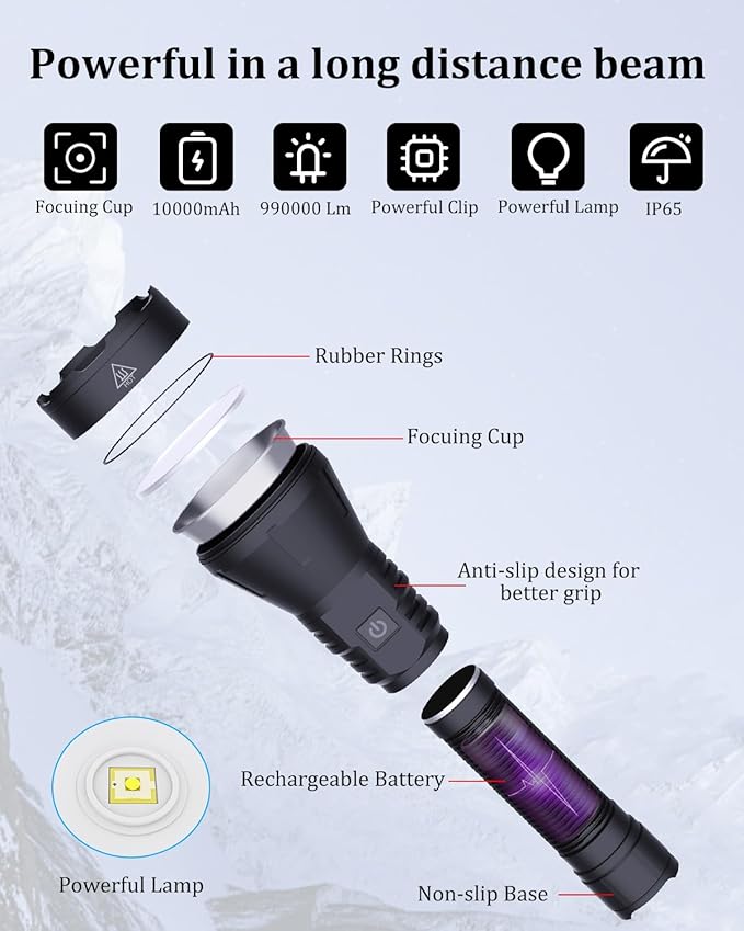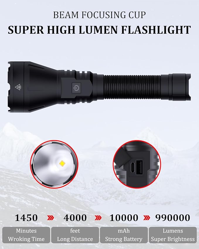 - Special Feature : Long Range, aluminum alloy with excellent hardness, Adjustable Light Modes, Super Bright & 990000 Lumen, 10000mAh Rechargeable ΒATTERY Long Range, aluminum alloy with excellent hardness, Adjustable Light Modes, Super Bright & 990000 Lumen, 10000mAh Rechargeable ΒATTERY