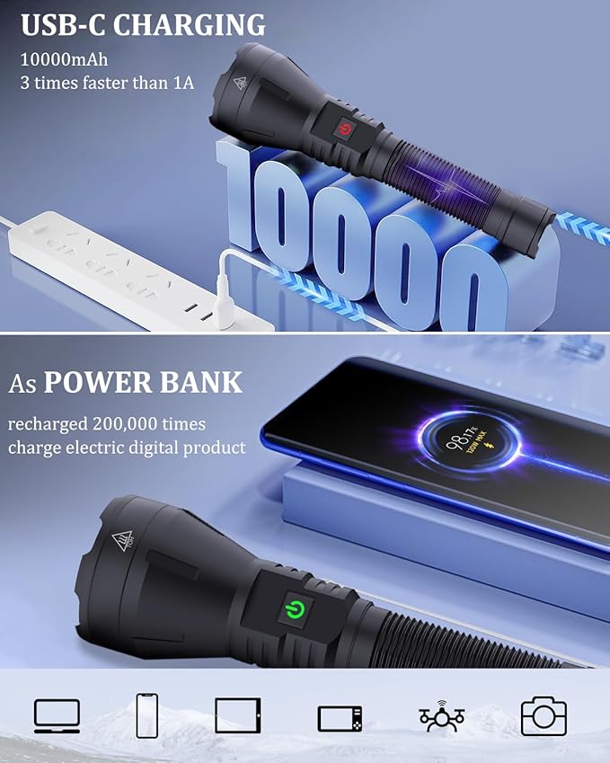 - 🔦[USB fast charge and Reverse charge]DRIVERWISH rechargeable flashlights uses the latest high-density 10000mAh battery to improve the battery life of the flashlight for 24 hours,flashlight rechargeable uses the latest fast charging chip to effectively shorten the charging time,which is 3 times faster than normal 1A flashlights. As a bank power supply to charge 5V2A mobile phones,computers, tablets and other digital devices.The flashlight can be recharged more than 200,000 times after testing.