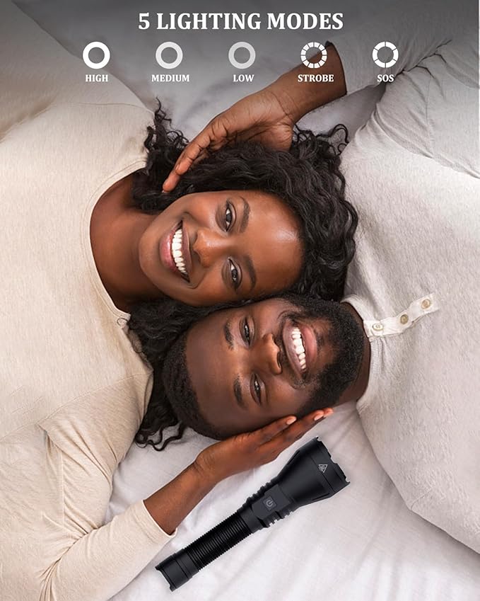 - 🔦[5 Lighting Modes]LightLink 2-flashlights for emergencies as a professional multi-function flashlight, with strong/medium/low light/strobe /SOS 5 lighting modes. Whether you're camping, hunting, hiking, biking, or experiencing a power outage, these modes will meet your needs. When there is a faint strange sound in the distance, it provides you with a clear view and ensures that you are in a safe environment.this is real tactical flashlights high lumens,not only flashlights.