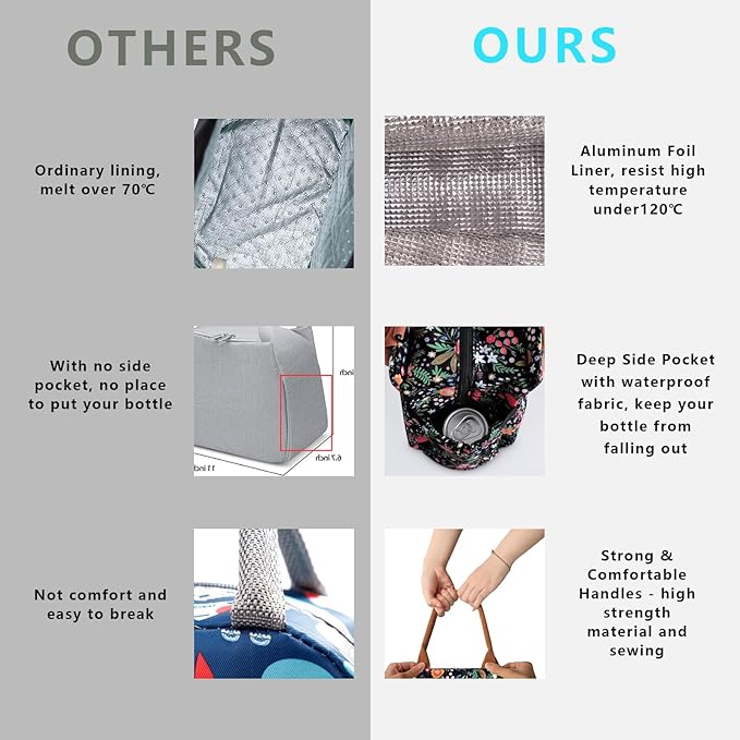 - ❤KEEP FRESH & WARM: This insulated lunch bag is made of water-resistant leakproof oxford cloth, easy clean food safe aluminum foil inner lining, and padded with thicken EPE foam will keep your food cold or thermal for 4-6 hours. Tips: Putting ice packs into the bag could keep cold for longer time.
