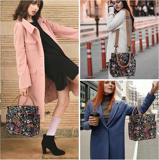 Joymee Lunch Bag Women, Leakproof Insulated Floral Lunch Box with Adjustable Shoulder Strap Large Reusable Adult Lunch Box Lunch Tote Lunch Bag with Water Bottle Holder and Side Pockets-Multi-Floral