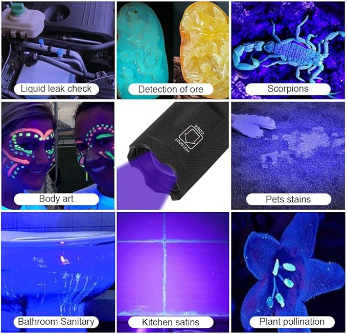 - MULTI-PURPOSE UV FLASHLIGHT BLACK LIGHT - Plant worms Exposure, Bed bug Detection, Bathroom Stains Reveal, Bank Note/ID Card Authentication, Uranium or Radioactive Glass Verification, Rock Mineral Reveal, Black Light Paint Reveal, Fluorescent World Exposure Ect