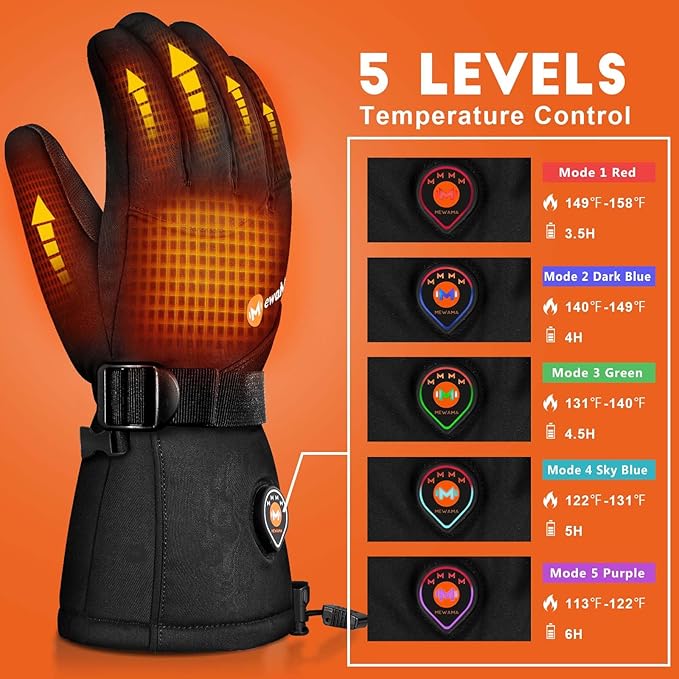 - 7.4V 3000MAH Rechargeable Lithium-Ion Battery - Our warm motorcycle gloves include a pair of rechargeable lithium batteries that can be adjusted for five levels of temperature. The gloves last approximately 2.5- 8 hours at the 1 level (around 113 ℉:blue light), 2 level (122 ℉:green light), 3 level (131℉:cyan light), 4 level (140 ℉:purple light), 5level (149℉:red light), Keep you warm through the winter.