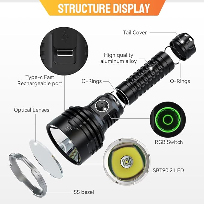 - 【RGB Flashlight】 This LED flashlight uses Anduril 2.0 user interface, which is specially designed for ordinary gamers and flashlight lovers. The Anduril 2.0 system is mainly used on the switch button, you can choose your favorite color for your button and find it quickly in the dark even when the flashlight is not on. The 7-button side switch can set the auxiliary light status: Off-Low-High-Flash.